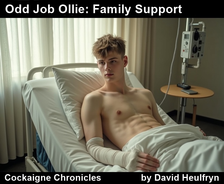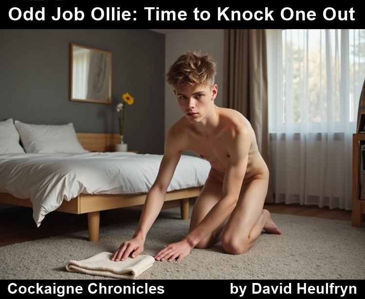 Thankfully, Ollie manages to go the day without getting fucked. His hole is still sore and needs a break. He has a few jobs to do, and the first one is for a sweet old lady, Mrs Green. There’s no chance of getting fucked there. But he does lose his shorts. When he gets home, his dad has discovered that he has started to work for Mr Cremaster, and Cockaigne Construction isn’t happy.